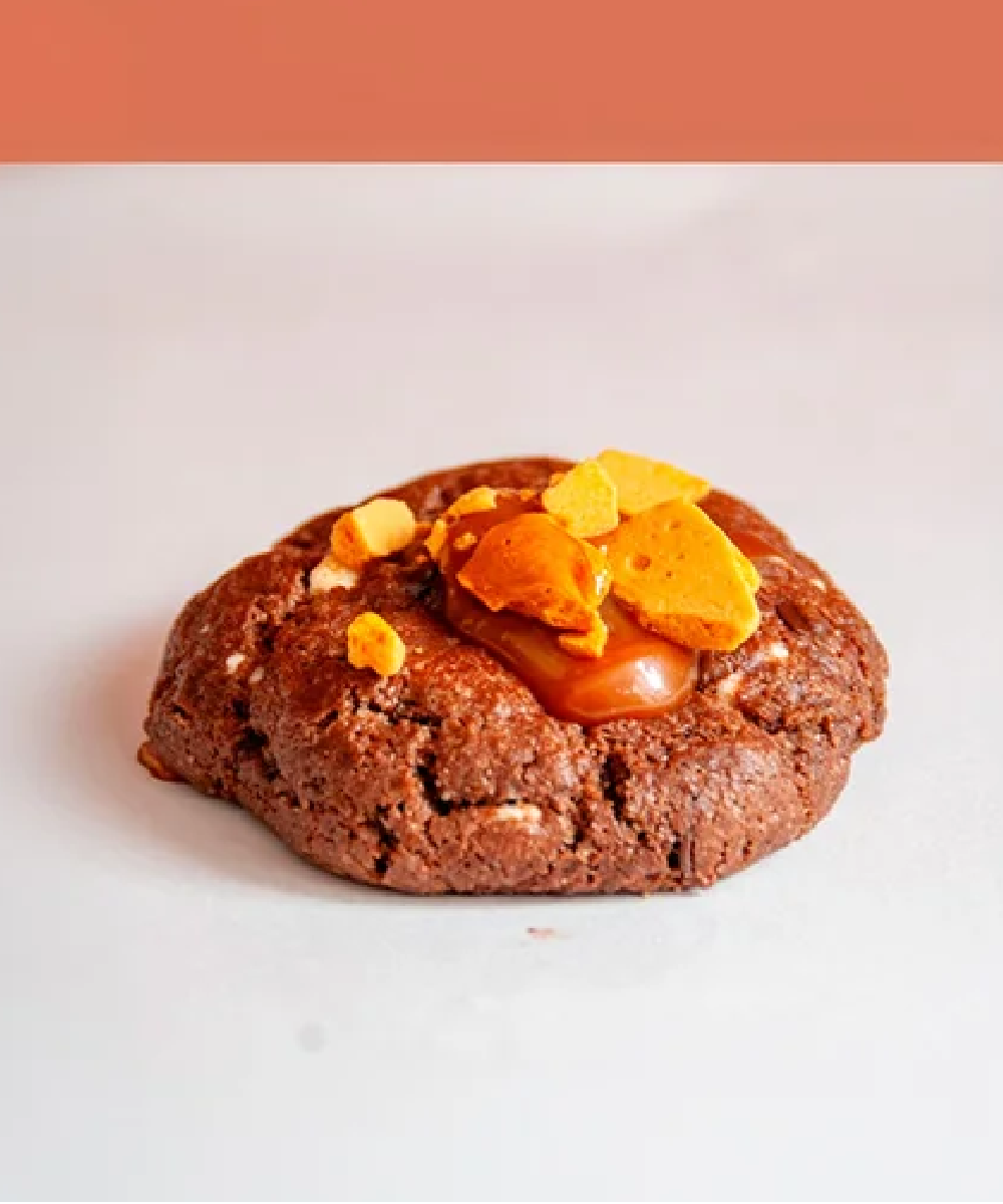 Galleta de chocolate con chunks de chocolate amargo, chips de chocolate de leche y trozos de chocolate blanco, rellena de caramelo salado y terminada con crujientes de caramelo